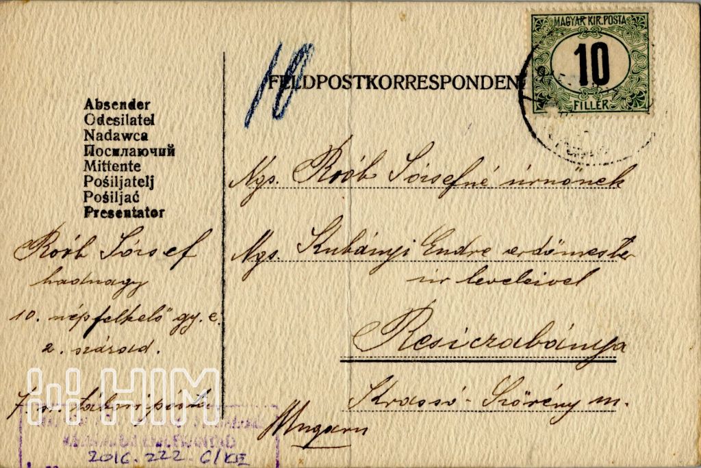 Roób József feleségének apósáék címére írt tábori postai levelezőlapja Przemyślből, 1914. december 31.