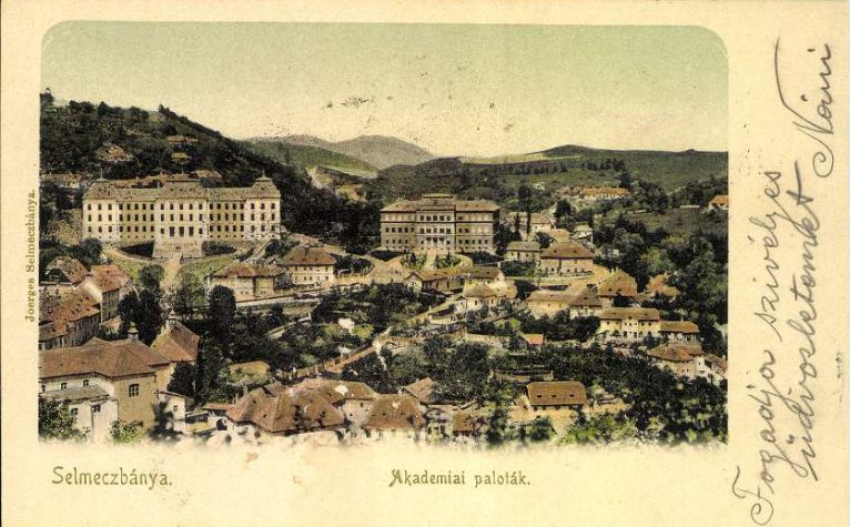 Képeslap: Selmecbánya, a Bányászati és Erdészeti Akadémia épületei 1901 körül, Roób tanulmányai idején.