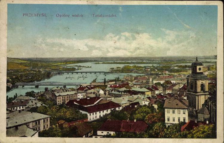 Képeslap: Przemyśl városa a San folyóval. Jól látszik a San folyó hatalmas víztömege, mocsaras-vizenyős partjai. A lapot az erőd visszafoglalása után odavezényelt, az élelmezési osztályhoz beosztott Stiffel Pál küldte haza feleségének Budapestre: „… ha szabadidőm van itszoktam sétálni it valamikor a legnagyob harcok folytak ez a két vashid teljesen felvolt robanva…”