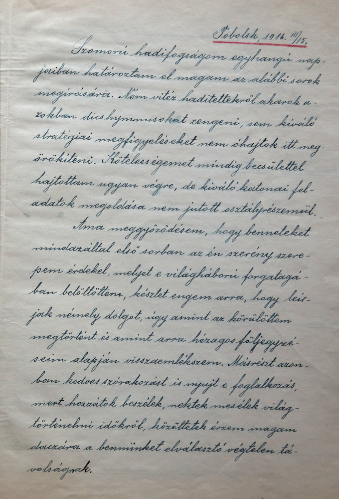 Mérnöki szemmel tekintve az erődrendszerre látta a katonailag szükséges tennivalókat, ugyanakkor mélyen átérezte a környező falvak felgyújtásának emberi tragédiáit. Átesett a tűzkeresztségen, megtapasztalta embereivel az éjjeli járőrözés idegborzoló veszélyét, az orosz repülőgépek kiszámíthatatlan akcióit, méltányolva írta le a felderítők leleményes munkáját. A 2. század szakaszparancsnokaként, beosztott tisztként csak fokozatosan ébredt rá a valós helyzetre: realitásérzéke eleve nem sok jóval bíztatta, de pontosan érzékelte a testi-lelki kimerülés fokozódó jeleit, az egyre csekélyebb élelmezést, a felmentés és a kitörés reménytelen voltát. Különösen az ünnepeken elérzékenyülve gondolt az otthoniakra, halálfélelmét is övéiért érzett felelősségvállalása erősítette fel. Megbízható, kötelességtudó lévén 1915. február 6-án géppuskásosztag parancsnoknak nevezték ki, századparancsnoki hatáskörrel. Az erőd átadásakor, 1915. március 22-én esett orosz hadifogságba, s az 1920-as év még mindig rabként érte.
