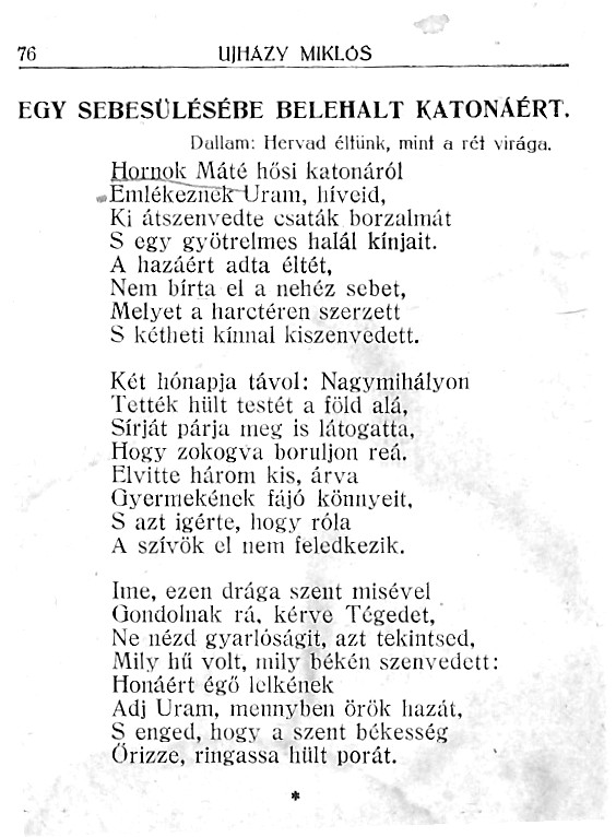 Hornok József névvel két hősi halott katonát találtam az adatbázisokban. Egyikőjük, a 28 éves katona a halotti anyakönyv bejegyzése szerint eltűnt. A másik, azonos nevű harminchét éves, 4. honvéd gyalogezredbeli katona az orosz harctéren esett el. Ez a második tűnik az említett versben szereplőnek, lévén, hogy az őt sirató családtagok közül édesanyja és felesége mellett öt gyermeke is imádkozik érte.