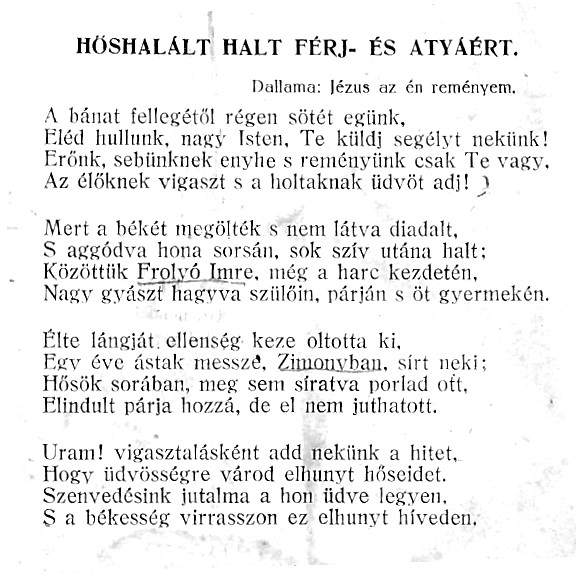 Timár Jánosért és Hornok Pálért feleségeik és gyermekeik imádkoznak, és az irgalmas Isten segítségét kérik. Hornok Pál talán azonos lehet azzal a katonával, aki a 101. gyalogezred alakulattörténetében hősi halottként szerepel.