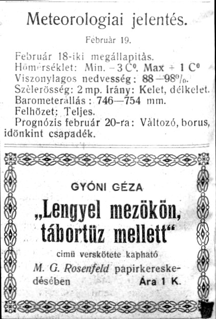 Időjárás-jelentés és a Gyóni-kötet hirdetése a Tábori Ujság 1915. február 20-i, 115. számában