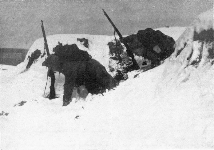 Tél Galíciában. Lőszert szállító csapat táborozása a hóförgetegben.