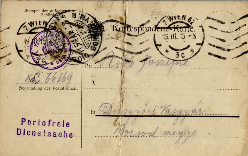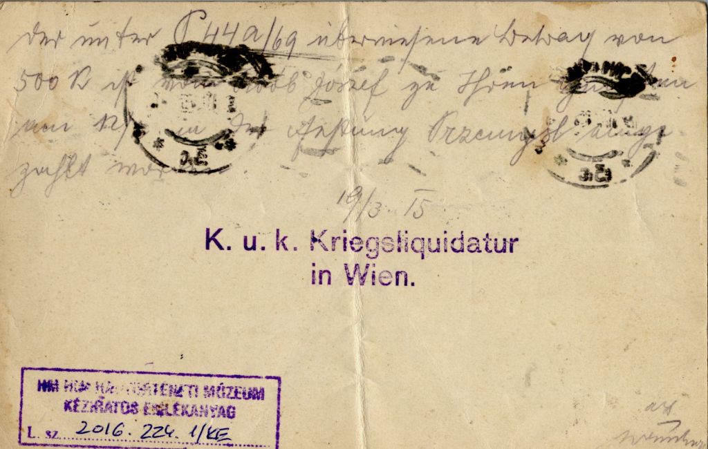 Der unter P 44a/69 überwiesene Betrag von 500 K ist von Roób József zu Ihren Gunsten am 12/3 in der Festung Przemysl angezahlt worden. 19/3. 15. Bélyegzett aláírás: K. u. k. Kriegsliquidatur / in Wien A két előlapi bécsi bélyegzőlenyomat tintája átüt a papíron. [fehér német postai levelezőlap – feladási bélyegzés: Wien 19. III. 15; bal felső sarkában még egy elmosódott feladási bélyegzés, rajta érkezési bélyegzés: Diósgyőri Vasgyár 915 már 28. Borsod vm. A.; rajtuk K. u. k. Kriegsliquidatur in Wien köriratú bélyegző-lenyomat; A postaköltség-mentesség indoka rovatban tintaceruzával: KSz 66869] (HTM Kéziratos Emlékanyag-gyűjtemény 2016.224.1/KE)