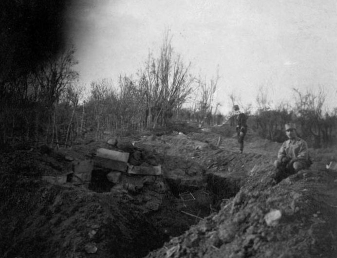 Márcz. 13. A mai nap folyamán a mi erődünket választotta a muszka czélpontul. D. e. 10-11 óra között folyt le a nagy bombázás 15 cm-es nagy gránátokkal. Ép az udvaron voltunk, amint hallottuk az első lövedék süvítését. Azonnal éreztük, hogy ez felénk tart. Szerencsénkre rövid volt, még az erőd előtt robbant szét. Igyekeztünk szobánkba jutni. Innen már biztonságban nézhettük a köröskörül lecsapódó robbanásokat. 2 gránát az udvarunkra esett, 3 meg a drótkerítésben robban szét mindenütt hatalmas gödröt vájva ki a földből. Volt olyan, mely közvetlen az ablakunk előtt csapódott be. Bízva azonban erődünk erősségében, melynek erős vastartókkal bordázott betonszerkezetét még magas földkéreg is takarta, egész nyugodtan viselkedtünk. Nem is történt semmi baj. Alig gyöngült egy kissé a bombázás, már is ott teremnek embereink a robbanás okozta gödrökben és különös igyekezettel keresik emlékül a gránátok repeszdarabjait. Az este érkezett parancs értelmében ezentúl éjjel mindenkinek ébren kell lennie és nappal kell aludni.
