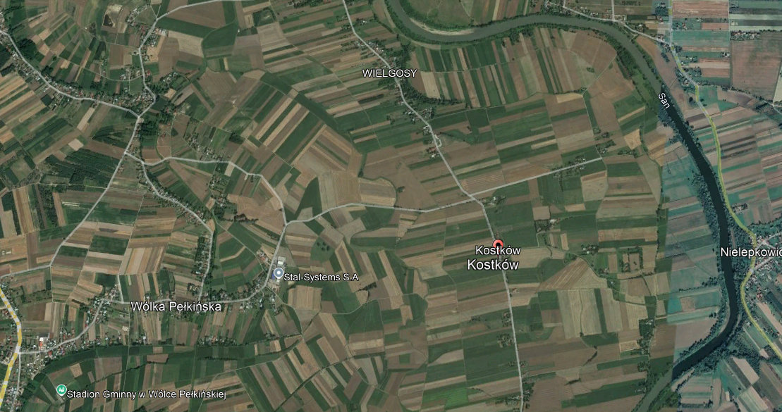 Műholdas felvétel Kostków környékéről (ma: Lengyelország), ahol 1914 októberében a magyar és az orosz állások húzódtak. Itt halt hősi halált Szabó alezredes.