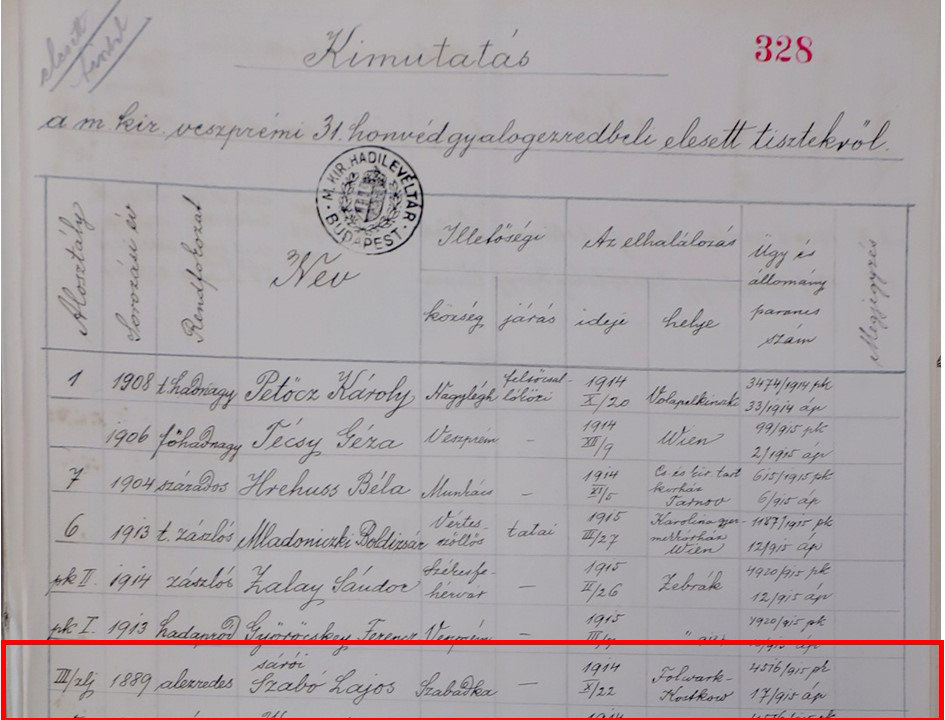 (Forrás: Hadtörténelmi Levéltár II. 608. M. kir. veszprémi 31. honvéd gyalogezred iratai, 19. doboz)