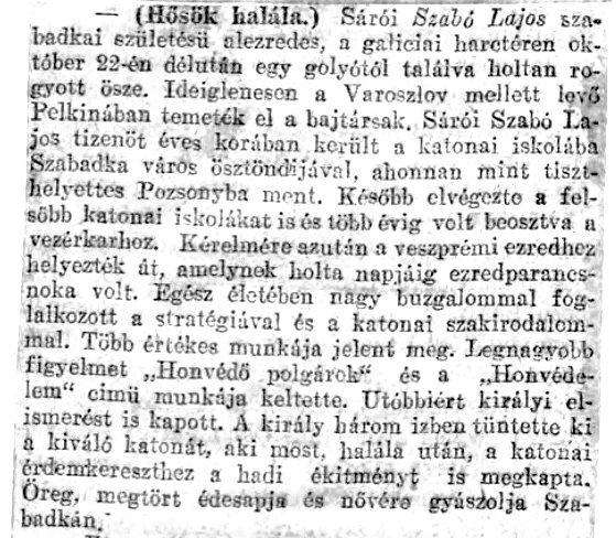 Újsághír sárói Szabó Lajos alezredes haláláról