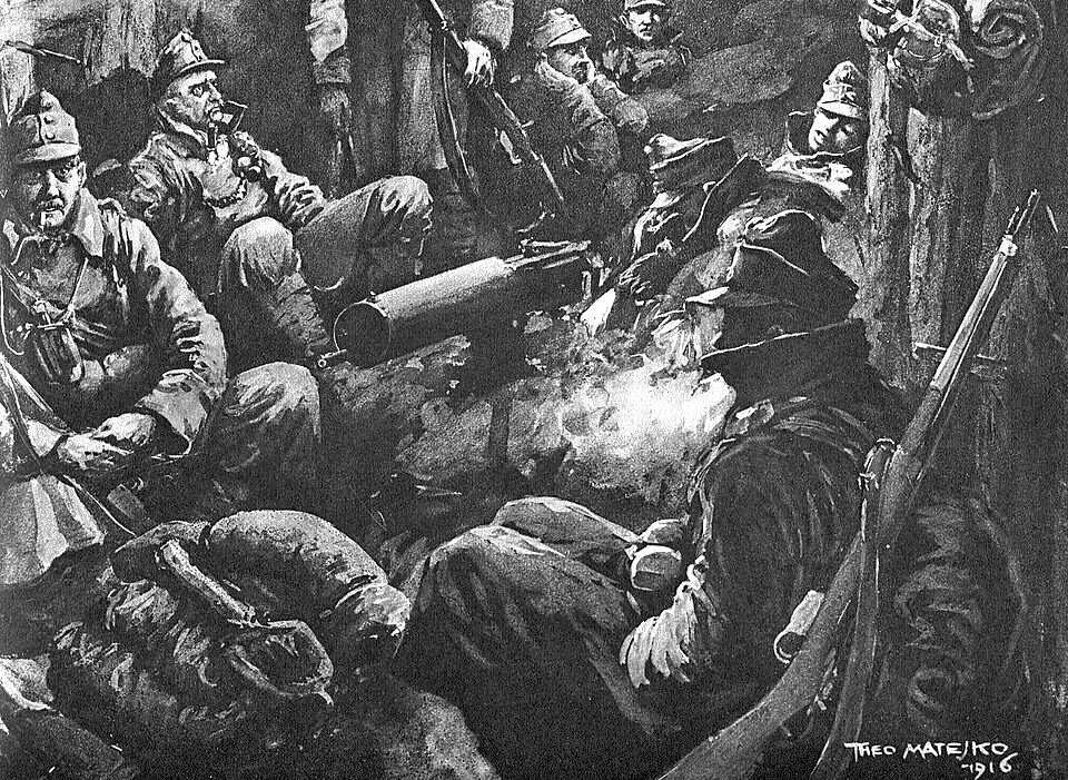 Az osztrák illusztrátor, Theo Matejko (1893–1946): Fedezék a volhíniai fronton, ellenséges pergőtűz alatt, 1916. c. rajza kiválóan érzékelteti a katonák részben beletörődő, részben feszült várakozását a bevetés előtt.