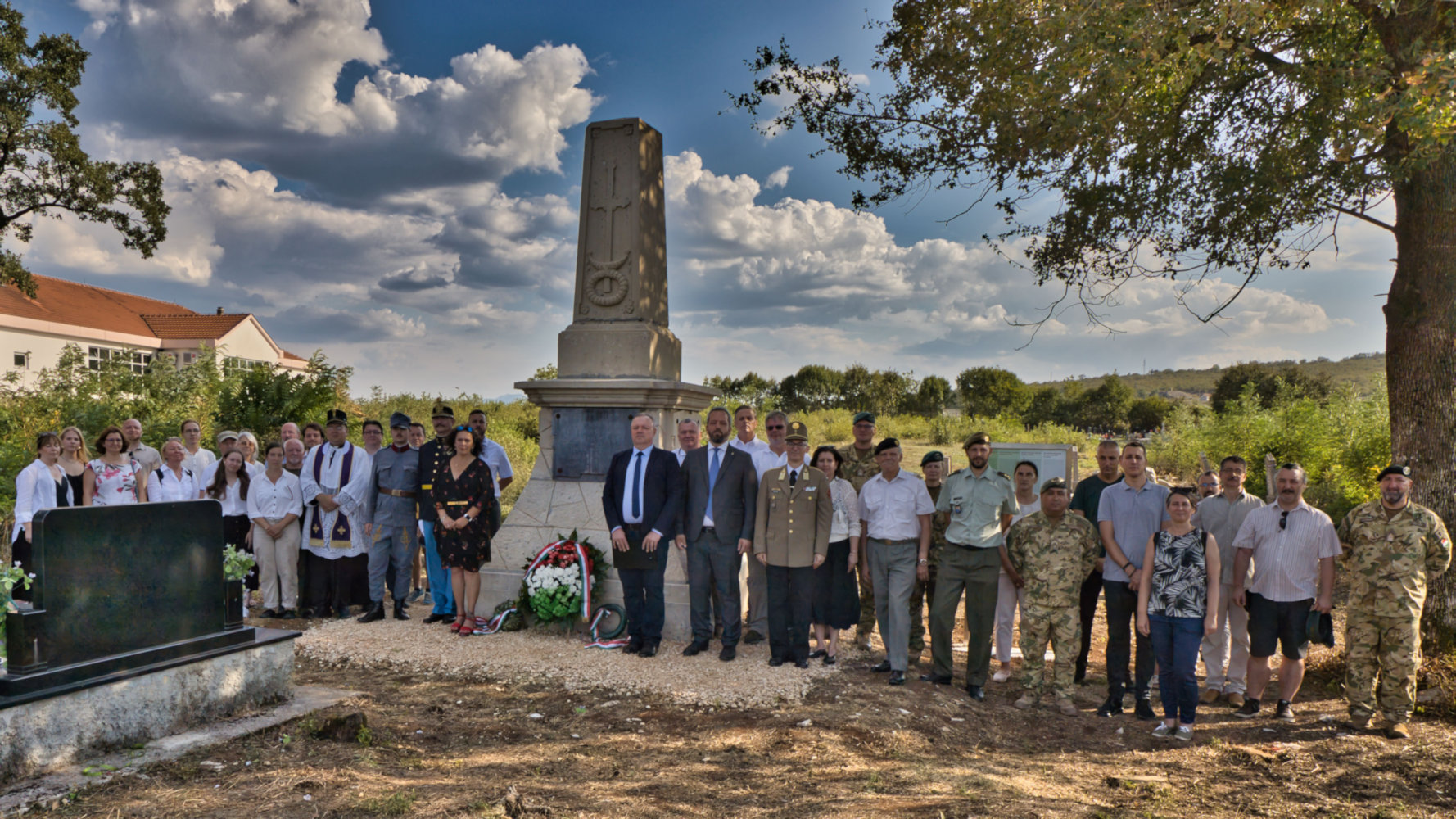 A bileki halálmars felújított emlékműve előtt, 2024. augusztus 30-án, az avatás 120. évfordulóján az NHKA által szervezett bosznia-hercegovinai emlékút és a bilećai megemlékezés résztvevői