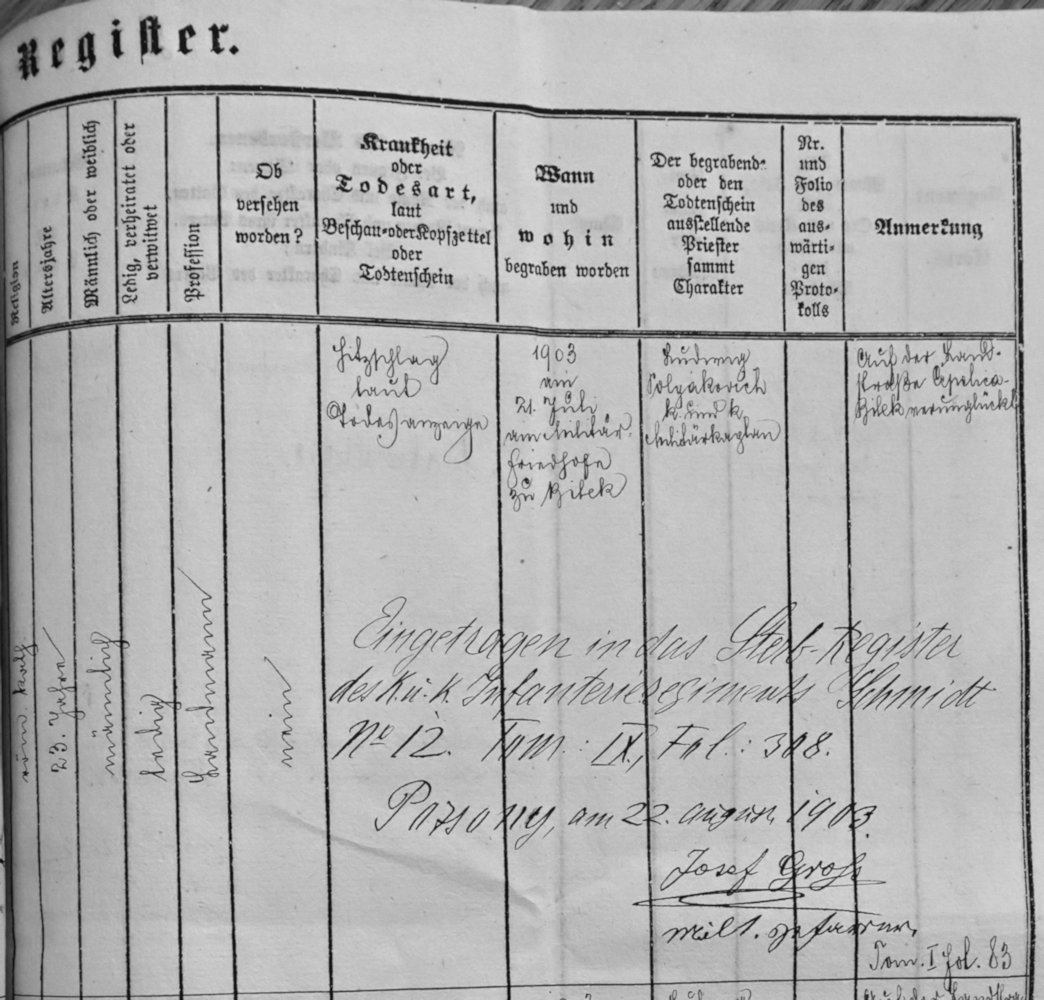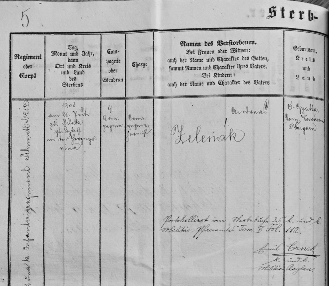 Zelenák András halálesetének a bejegyzése a bileki katonai temető halotti anyakönyvében.