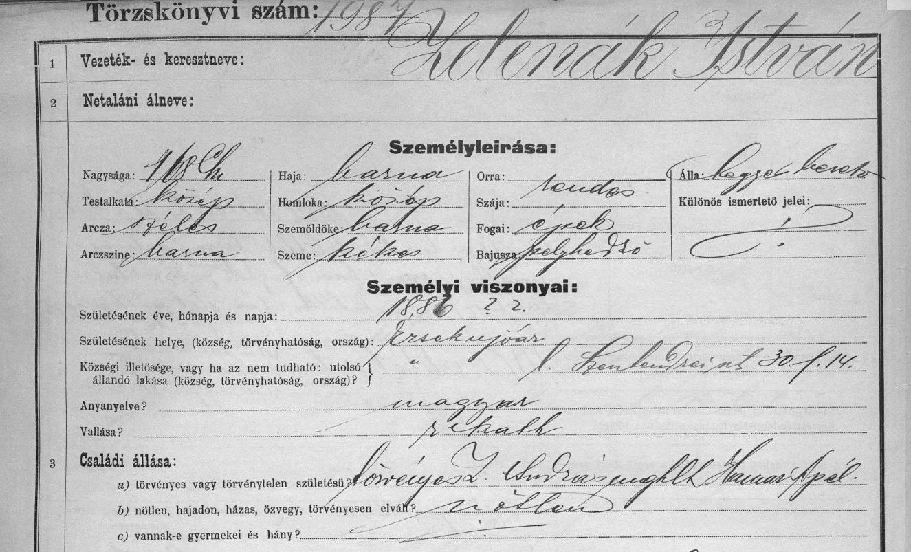 Zelenák István fogolylapjának a részlete a személyleírásával.