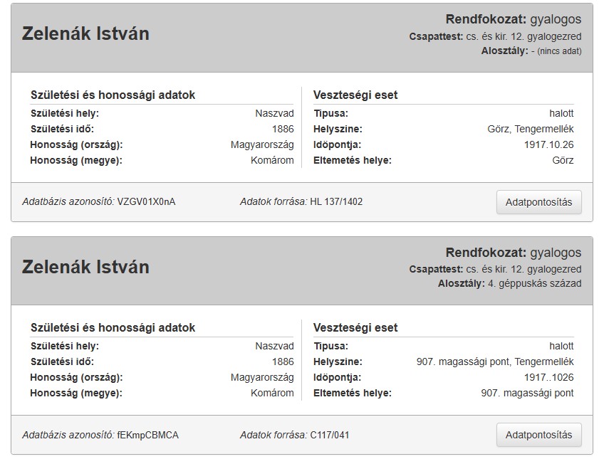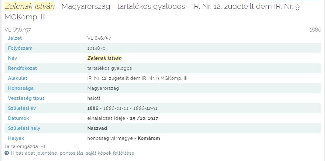 Zelenák István hősi halálára vonatkozó adatok az MNL oldalán az elsővilágháborús veszteséglista alapján.
