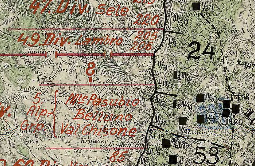 A cs. és kir. 9. gyalogezred harcainak a helyszíne 1917. október 24-én. Zelenák István halálának a helye, a 907-es magaslat a 24. hadosztályt jelentő szám „2”-es számjegyének felső részénél látható.