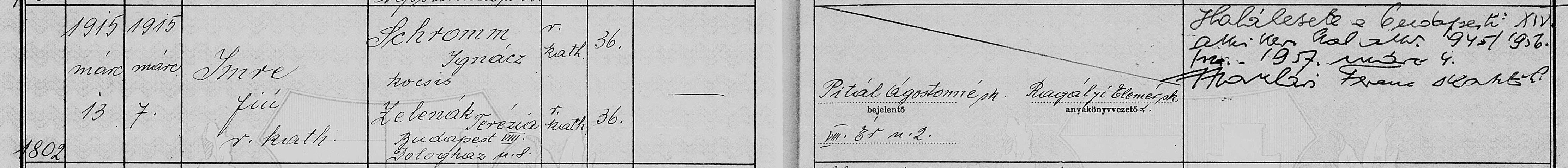 Schromm Imre születési bejegyzése a budapesti VIII. kerületi születési anyakönyvben.