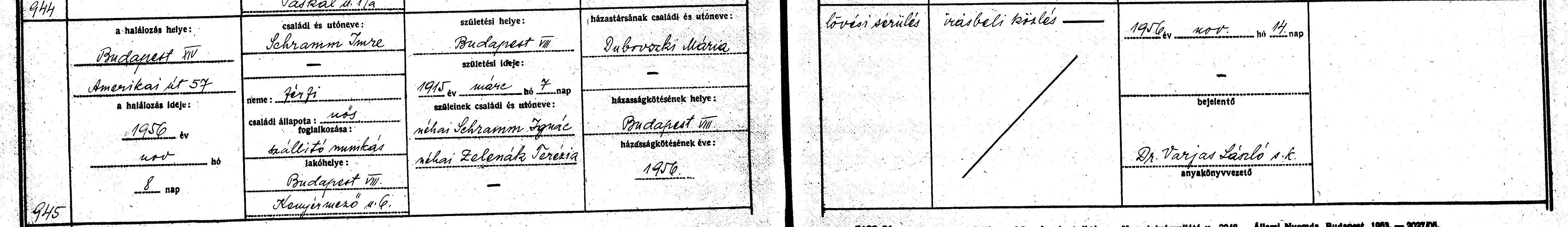 Zelenák Julianna menye, Prósz Lajosné Kellner Terézia Budapest ostromakor történt halálesetének bejegyzése a Budapest III. kerületi halotti anyakönyvben.