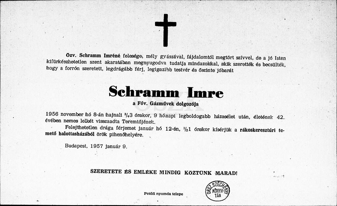 A gyászjelentése alapján a „forrón szeretett, legdrágább férj, legigazibb testvér és őszinte jóbarát” Schramm Imrét a rákoskeresztúri temetőben temették el 1957. január 12-én.