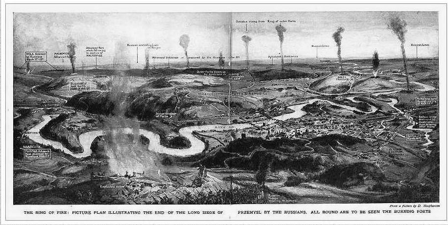 A tűzgyűrű: panorámakép, amely Przemyśl hosszú orosz ostromának végét délnyugat felől ábrázolja; körben az égő erődök láthatók. D. MacPherson (1871–1951) illusztrátor és művész, a The Illustrated London News igen színvonalas képes magazinja, az 1900–1964 közt megjelenő The Sphere munkatársa képe alapján készült nyomat.