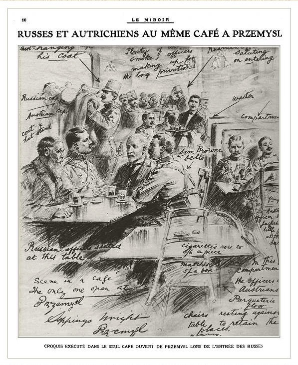 A francia „Le Petit Parisien” hetilap 1910-es évekbeli melléklete, a Le Miroir hírlap 1915. június 20-i, 82. számában közzétett vázlatrajz az egyetlen kávézó belsejét mutatja, amely nyitva maradt Przemyślben, amikor az oroszok elfoglalták a várost. A XI. orosz hadsereget kísérő H.C. Seppings-Wright (1849–1937) angol művész, illusztrátor, haditudósító műve.
