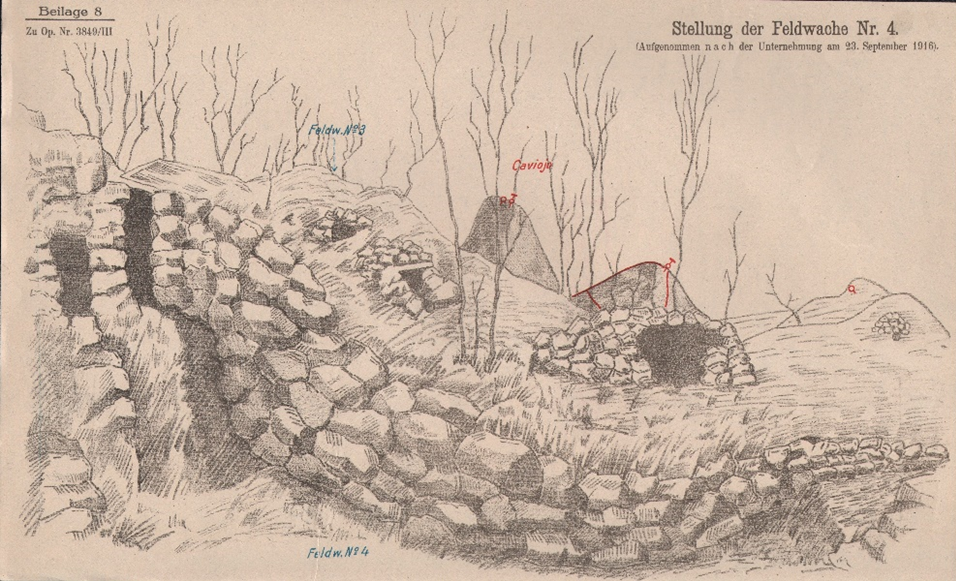 Az olaszok (részben Alpinik) gyakori kézigránáttámadásaik során az állásaikból a déli kavernáig nyomultak előre és gránátjaikat – a saját állások fölé emelkedő állásaikat ügyesen kihasználva – oly módon dobták, hogy azok a kavernáig gurultak és ott a torony és a kaverna bejárata mellett robbantak. A védelem többnyire a következő módon játszódott le: a torony őrsége riadót vert és megnyitották a tüzet, amire az olaszokat a tábori őrs állásából és az összekötő árok őrhelyeiből kézigránátok dobásával ismét elűzték.