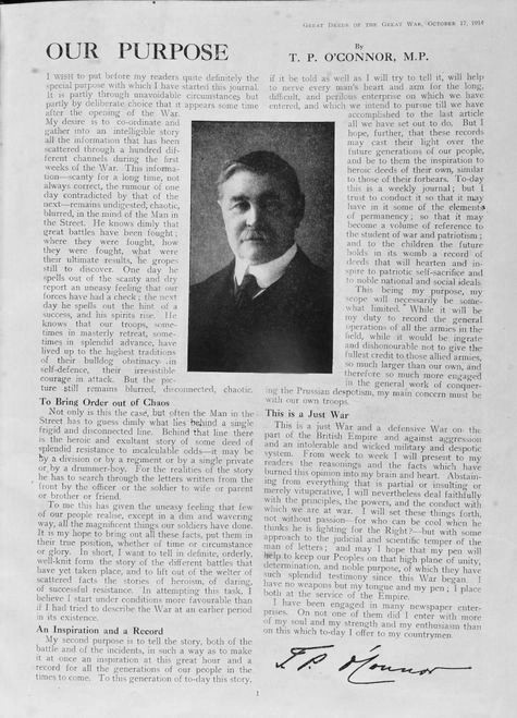 A szándéknyilatkozat a szerkesztő arcképével a T.P.’s Journal of Great Deeds of the Great War első, 1914. október 17-i számában.