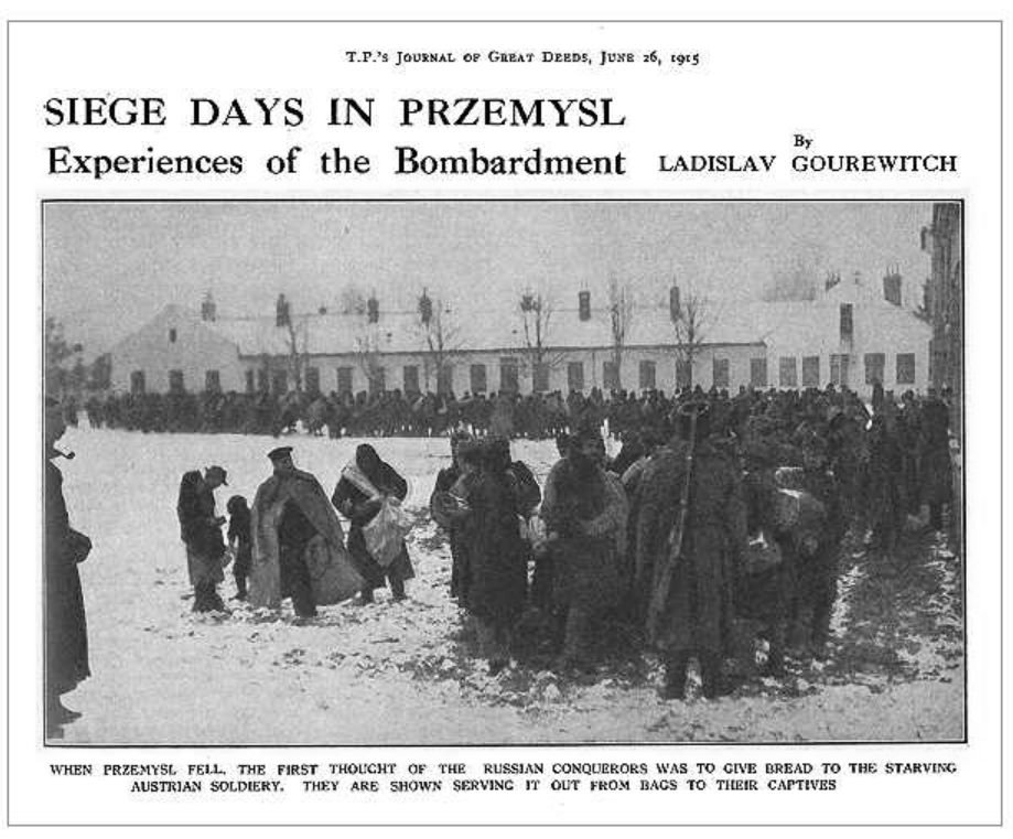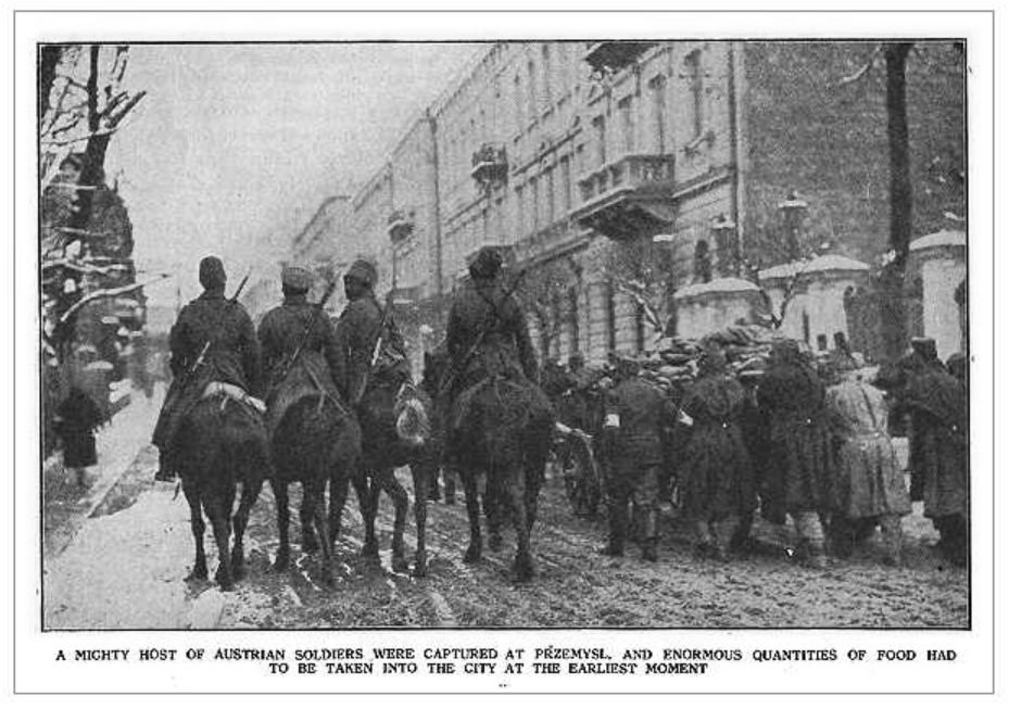 „Amikor Przemyśl elesett, az orosz hódítók első gondolata az volt, hogy kenyeret adjanak az éhező osztrák katonáknak. Azt látjuk, hogy zsákokból osztják ki foglyaiknak.” – Fegyvertelen osztrák‒magyar katonák menetoszlopa.