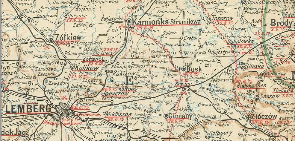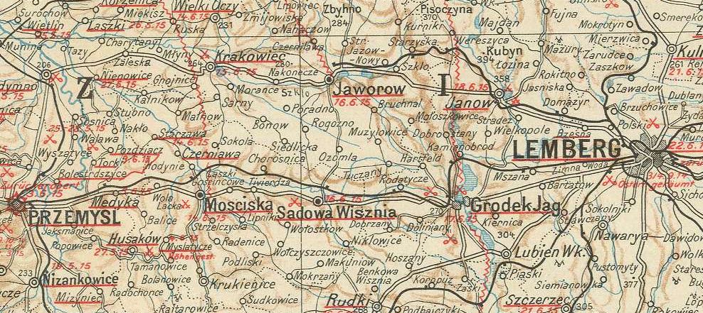 1915. március 26. Mielőtt eljutunk Lembergbe, megpillantjuk a reggeli szürkületben a számunkra oly ismerős vidékeket Grodeknél és Kamienobrodnál, az egyszerű és kettős kereszteket a sírok mellett, mind tömegsírok, a gördülő vonatból jól megkülönböztethetőek az egykori csatamezőkön futó védőárkok. Körülbelül reggel 8 h-kor befutunk a lembergi pályaudvarra. – Itt már készítettek nekünk reggelit, teát, kávét, bifszteket, mind nagyon ízlett nekünk. – A reggeli alatt megjelent W. orosz nagyherceg is népes kíséretével. – Tőlünk az urak már be is váltották pénzünket az oroszra. – De. 10 h-kor elhagyjuk Lemberget, a házakból, erkélyekről az és ablakokból a lakosság igen barátságosan integetett, sokan sírtak is. Mindnyájan tudták, hogy ez a vonat az első przemyśli fogolytiszteket viszi hazájukból a távoli idegenbe. – Estére elértük a határhoz közeli Zabloczét, itt átvagonírozunk és az éjszakát ezen a nyomorúságos állomáson két váróteremben töltjük, ahol alig van helyünk és nagy nehezen teát kapunk. (Lovag Arlow Viktor ezredes, a przemyśli VI. védelmi kerület parancsnokának magánnaplójából. Forrás: Miklauzič István ford., szerk., jegyz.: Kard és fátyol. Lovag Arlow Viktor ezredes Przemyśl–Vlagyivosztok–Győr 1914–1920. H. n. 90. o.)