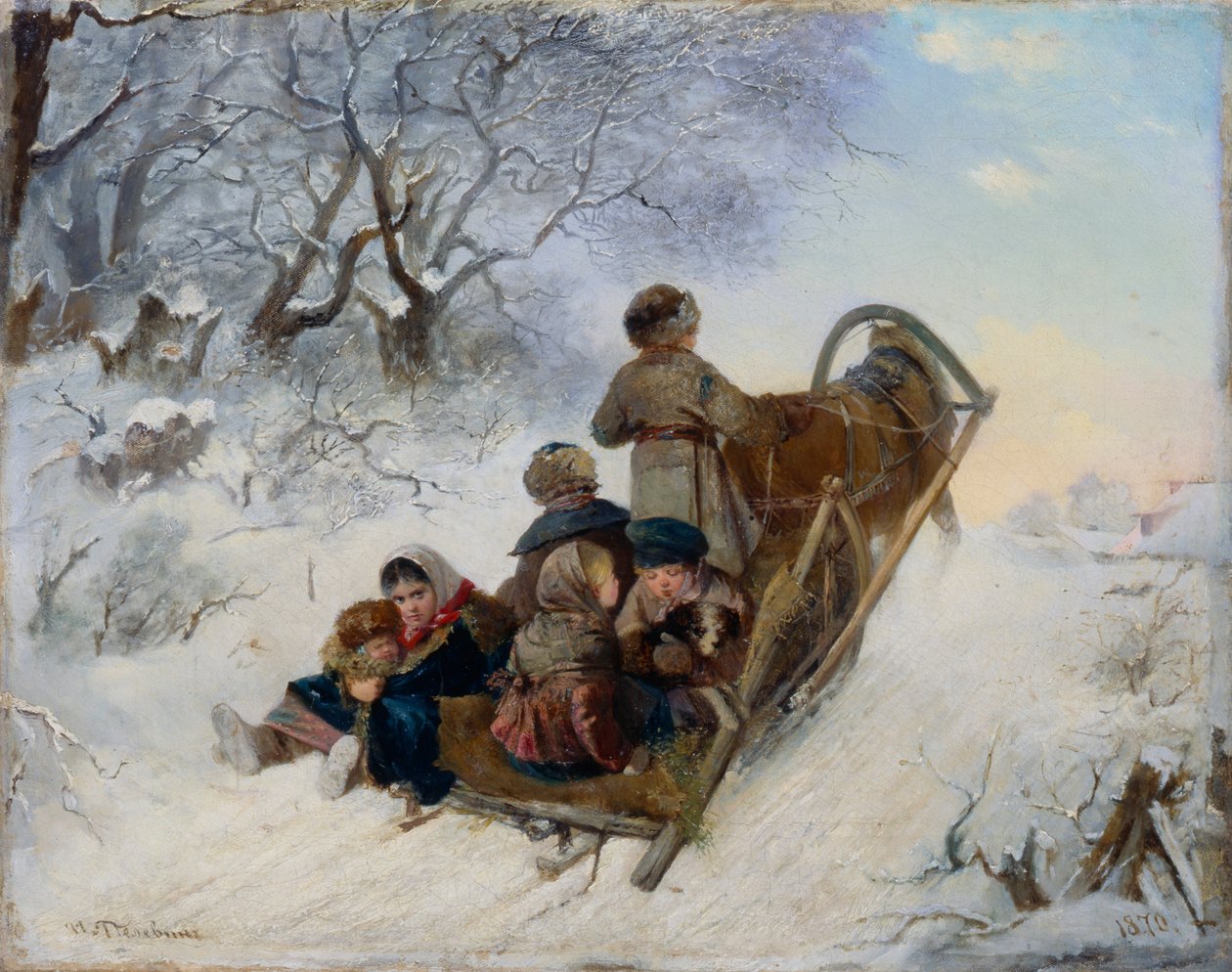 Az orosz művész, Ivan Andrejevics Pelevin (1840–1917): Gyemekek a ló vontatta szánon című, 1870-ben készült festményén jól megfigyelhető a szán kialakítása és annak hátrányai