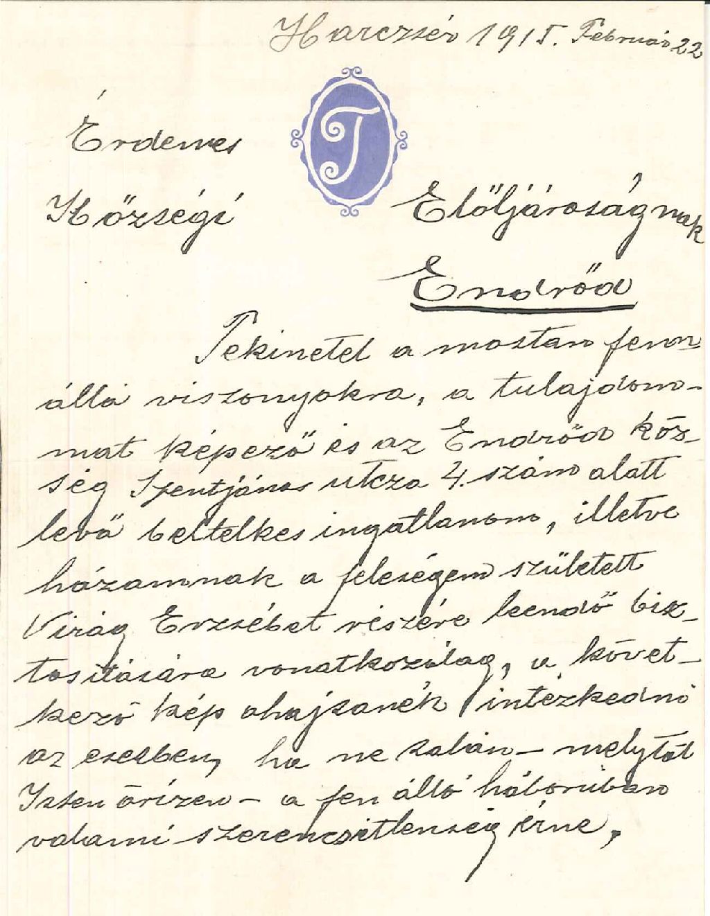 Tímár János endrődi ácsmester végrendelete 1915. február 22-én keletkezett a harctéren. A magyar királyi 1. honvéd lovas tüzérosztály kötelékében szolgáló katona végintézetét az endrődi községi elöljáróságnak küldte meg. A két tanú, Gyulai Mihály főtüzér és Németh Pál jelenlétében született dokumentumban Tímár úgy rendelkezett, hogy az Endrőd Szentjános utca 4. szám alatti beltelkes ingatlanjának egyedüli örököse felesége, Virág Erzsébet legyen.