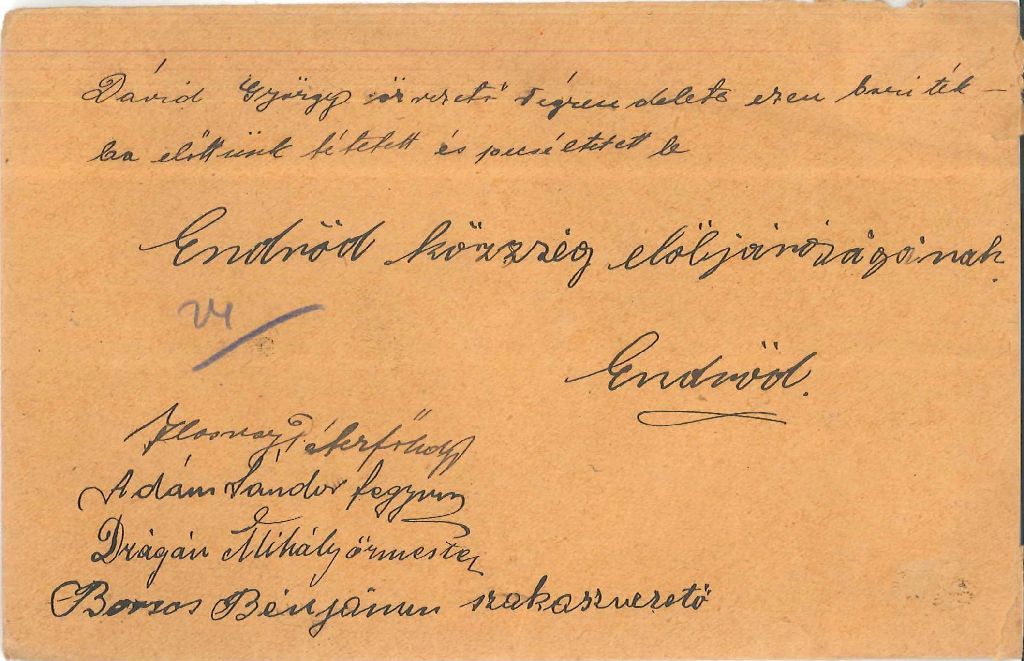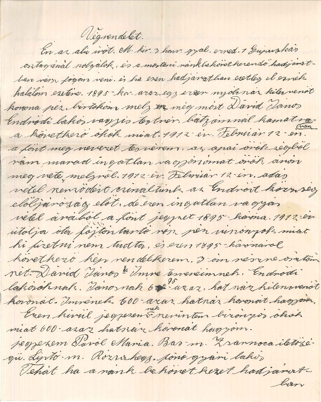 „Én az alu írot m. kir. honv. ezred 1. gépuskás osztályánál szolgálok és a mostani ránk bekövetkezendő hadjáratban rész fogom veni, és ha ezen hadjáratban esetleg el esnék, halálom esetére 1895 kor. Azaz ezernyolcszáz kilencvenöt korona pénz birtokom, amely még most Dávid János Endrődi lakós vagyis testvér bátyámnál kamatra van, a következő okok miatt. 1912 év február 12-én a fönt megnevezett testvérem az apai örökségből rám maradt ingatlan vagyónomat örö áron megvette, melyről 1912 év február 12-én adás vétel szerződést csináltunk az Endrőd község elöljárósága előt. 1912 utolja óta folyton tartó rossz pénz viszonyok miatt ki fizetni nem tudott, és ezen 1895 koronáról a következő képpen rendelkezem: 3 részre osztom szét. Dávid János és Imre testvéreimnek Endrődi lakósoknak, Jánosnak 695 azaz hatszáz kilencvenöt koronát, Imrének 600 azaz hatszáz koronát hagyom.