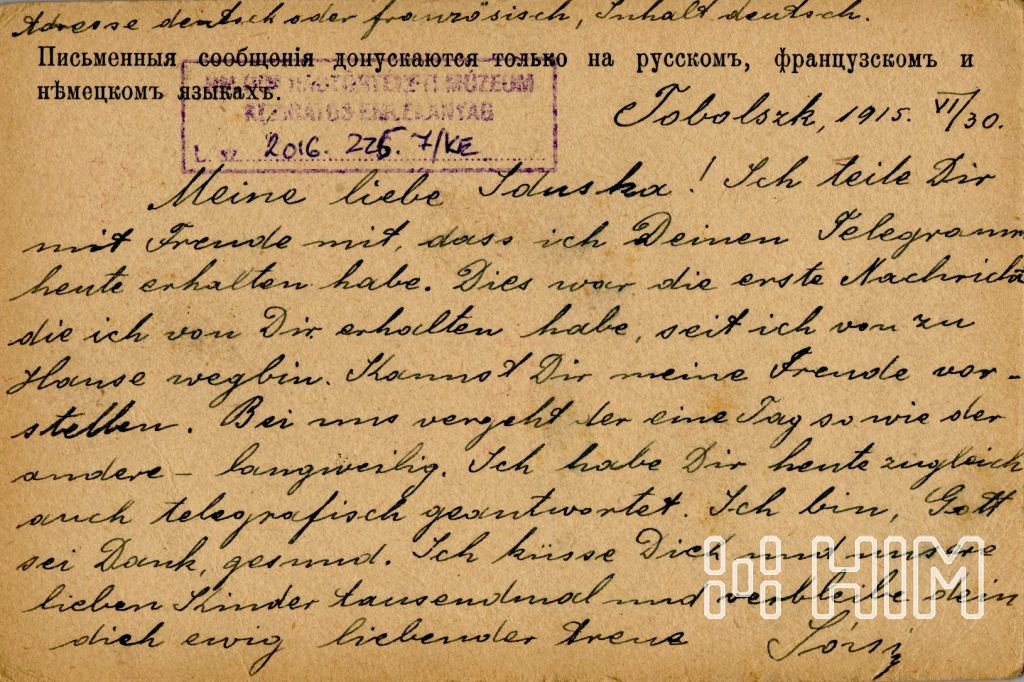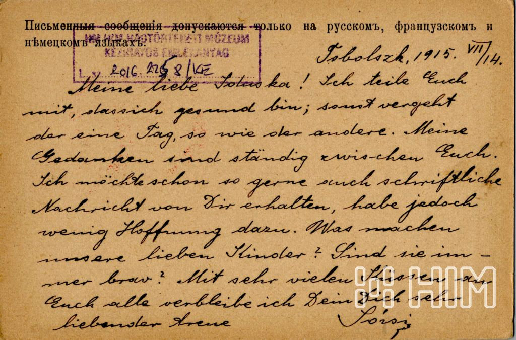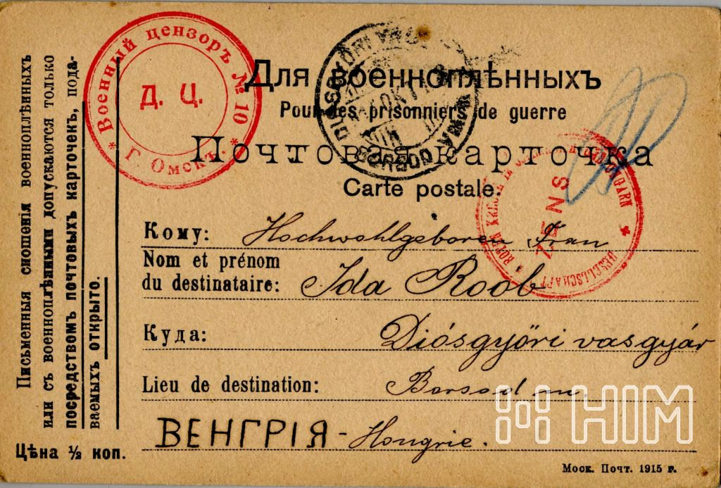 Mivel a tiszteket hadifogolyként nem kötelezték munkára, a huzamos tétlenségtől az unalom ölte a lelkeket, hiszen egészen új, passzív életet kellett megszokniuk. – Tintával megírt orosz-francia feliratú levelezőlap hadifoglyok részére – vörös omszki cenzúrabélyegzés (No. 10.), a bécsi Vöröskereszt vörös cenzúrabélyegzése, elmosódott diósgyőri-vasgyár érkezési bélyegzés (1915. október)