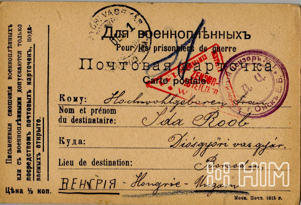 Társaihoz hasonlóan Roób József is hazaírt levelezőlapokkal igyekezett magát lefoglalni, ugyanakkor családfőként a távolból is követte a család életét. – Tintával megírt orosz-francia feliratú levelezőlap hadifoglyok részére – lila omszki cenzúrabélyegzés (No. 1.), bécsi vörös cenzúrabélyegzés, elmosódott diósgyőri-vasgyár érkezési bélyegzés (1915. december 1.)