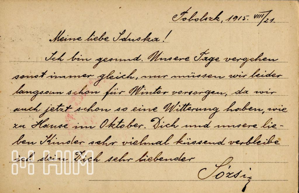 Mint látjuk, a levelezőlapok a cenzúra miatt egyáltalán nem időrendben érkeztek meg a címzetthez, aki viszont igyekezett mindenkit megnyugtatni, miszerint jól van és csak a tétlenségtől szenved. – Orosz-francia feliratú, tobolszki kiadású (?) és előrenyomott feladói feliratozású, hátoldalon kipontozott sorokkal ellátott levelezőlap hadifoglyok részére –orosz fekete (1915. szeptember 25.) és vörös tobolszki cenzúrabélyegzés (No. 21.), kivehetetlen bécsi cenzúrabélyegzés, diósgyőri-vasgyár érkezési bélyegzés (915.) október 28.]