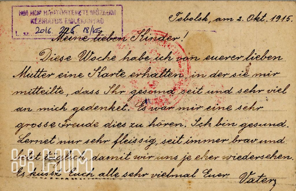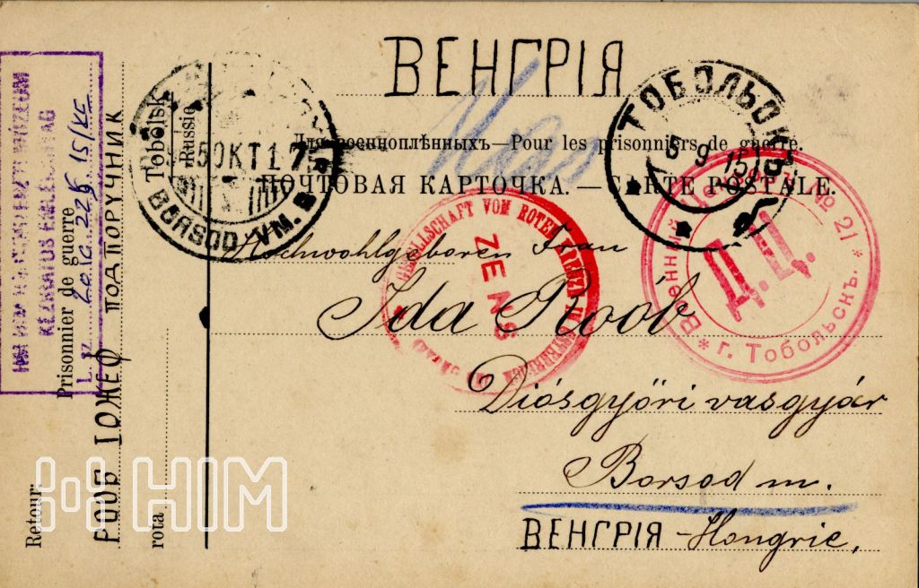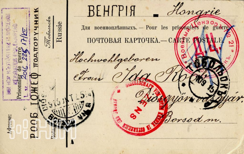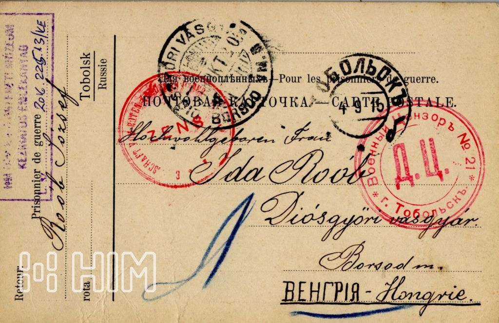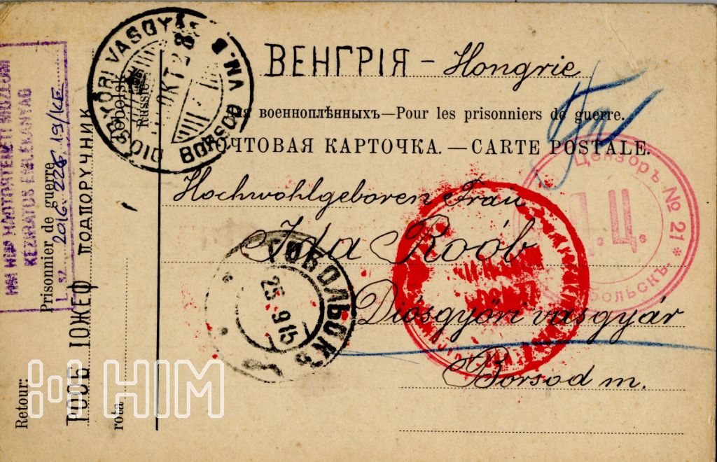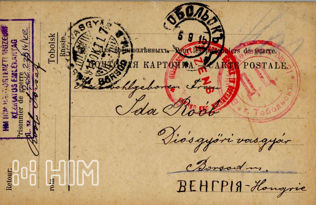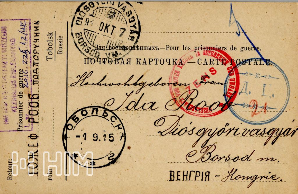 A fogság hetedik hónapját elérve Roób hadnagyhoz hasonlóan mindenki türelmetlenül várta a mielőbbi hazatérés lehetőségét, de egyre kevésbé hitt benne. – Orosz-francia feliratú, tobolszki kiadású (?) és előrenyomott feladói feliratozású, hátoldalon kipontozott sorokkal ellátott levelezőlap hadifoglyok részére –orosz fekete (1915. szeptember 10.) és vörös tobolszki cenzúrabélyegzés (No. 21.), a bécsi Vöröskereszt vörös cenzúrabélyegzése, elmosódott diósgyőri-vasgyár érkezési bélyegzés (1915. október 15.)