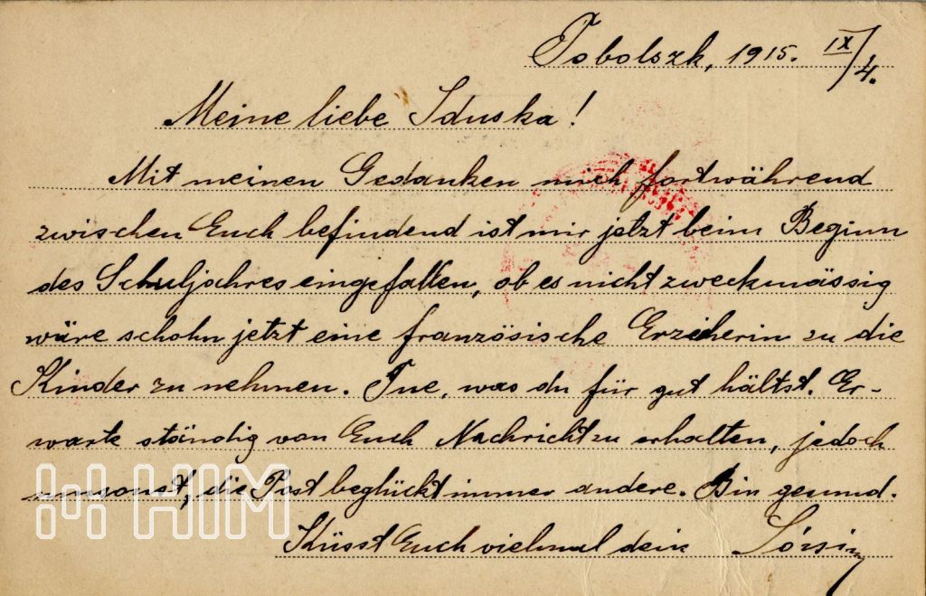 Még ezekből a rövid üzenetekből is kitűnik, mennyire megbízott Roób József a feleségében és hiányolta a családját. A nevelőnő nemcsak a nyelvtanulásban jelentett volna előnyt, de az etikett, viselkedés elsajátításában is. Az „igazi” francia nevelőnők azonban a világháború alatt nehéz helyzetben voltak Magyarországon, hiszen egy ellenséges ország polgáraiként internálták vagy kiközösítették őket. – Orosz-francia feliratú, tobolszki kiadású (?) és előrenyomott feladói feliratozású, hátoldalon kipontozott sorokkal ellátott levelezőlap hadifoglyok részére – fekete tobolszki (1915. szeptember 4.) postai és vörös tobolszki cenzúrabélyegzés (No. 21.), a bécsi Vöröskereszt vörös cenzúrabélyegzése, diósgyőri-vasgyár érkezési bélyegzés (1915. október 20.)