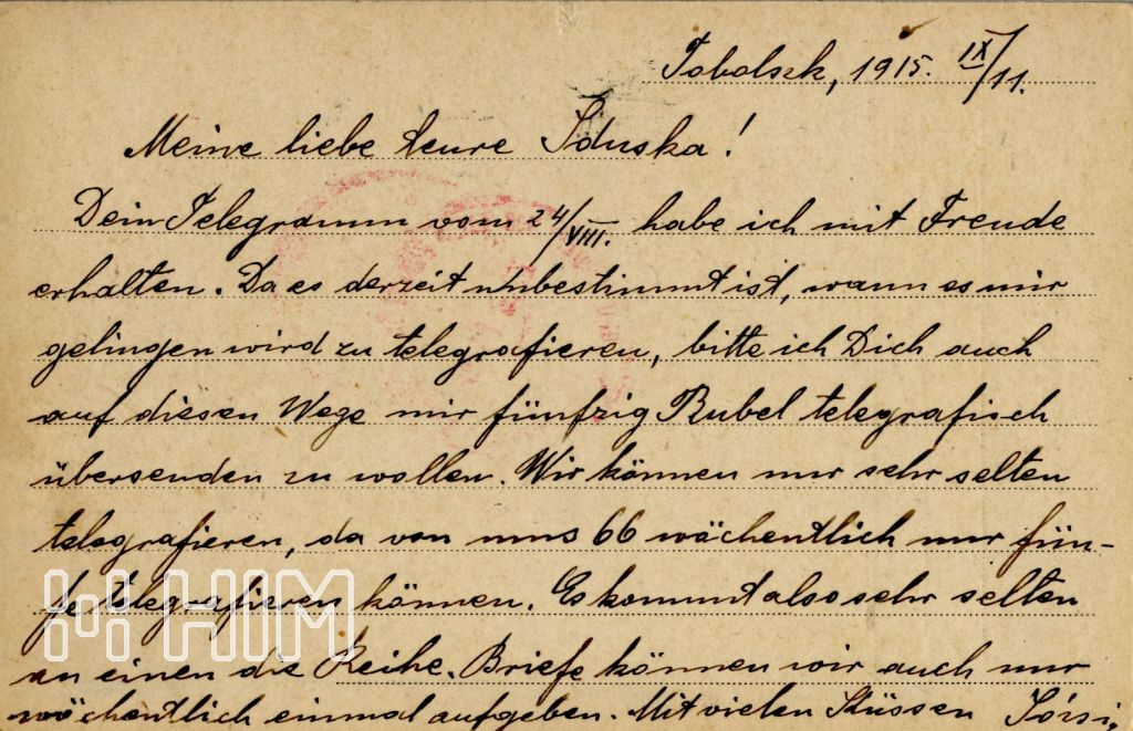 Dein Telegramm vom 24/VIII. habe ich mit Freude erhalten. Da es derzeit unbestimmt ist, wann es mir gelingen wird zu telegrafieren, bitte ich Dich auch auf diesen Wege mir fünfzig Rubel telegrafisch übersenden zu wollen. Wir können nur sehr selten telegrafieren, davon uns 66 wöchentlich nur fünfe telegrafieren können. Es kommt also sehr selten an einen die Reihe. Briefe können wir auch nur wöchentlich einmal aufgeben. Mit vielen Küssen Józsi