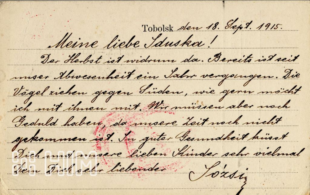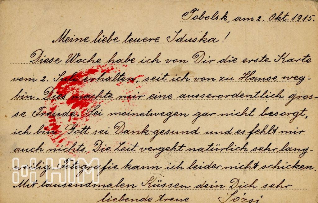 Roób József feleségének írt első lapja Tobolszkból finoman érzékelteti, hogy szó sincs a hazatéréséről. De leírja a legfontosabbat is, amely minden lapon szerepel: egészséges. – Orosz-francia feliratú, tobolszki kiadású (?) és előrenyomott feladói feliratozású, hátoldalon kipontozott sorokkal ellátott levelezőlap hadifoglyok részére – fekete tobolszki postai (1915. szeptember 1.) és kék tobolszki cenzúrabélyegzés (kézzel: 21.), a bécsi Vöröskereszt vörös cenzúrabélyegzése, halvány diósgyőri-vasgyár érkezési bélyegzés (1915. október 14.)