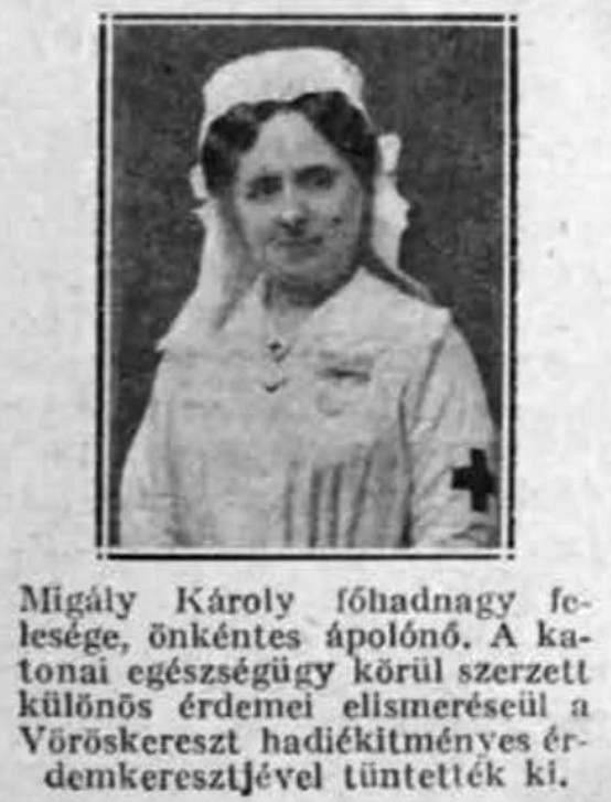 Mialatt férje hadifogságban volt, Migály Károly főhadnagy felesége odahaza folytatott jótékonysági munkát: a Vöröskereszt diósgyőri fiókja részére már a békeévek alatt is gyűjtött rendezvények révén adományokat – és persze önkéntes ápolónőként is tevékenykedett.