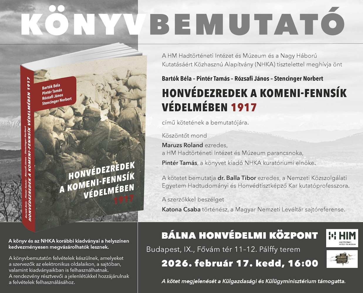 2026. február 17-én 16 órakor a Bálna Honvédelmi Központban mutattuk be a blogunk négy állandó szerzője által írt Honvédezredek a Komeni-fennsík védelmében 1917 című kötetet. A könyvbemutató alkalmával Pollmann Ferenc, a HM Hadtörténeti Intézet és Múzeum nyugalmazott hadtörténésze beszélt a könyvről, aki az elhangzott beszédét rendelkezésünkre bocsátotta. Szerkesztőségünk változatlan formában adja ezt közre az eseményen készült fényképek kíséretében.