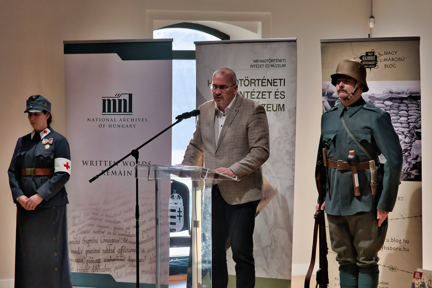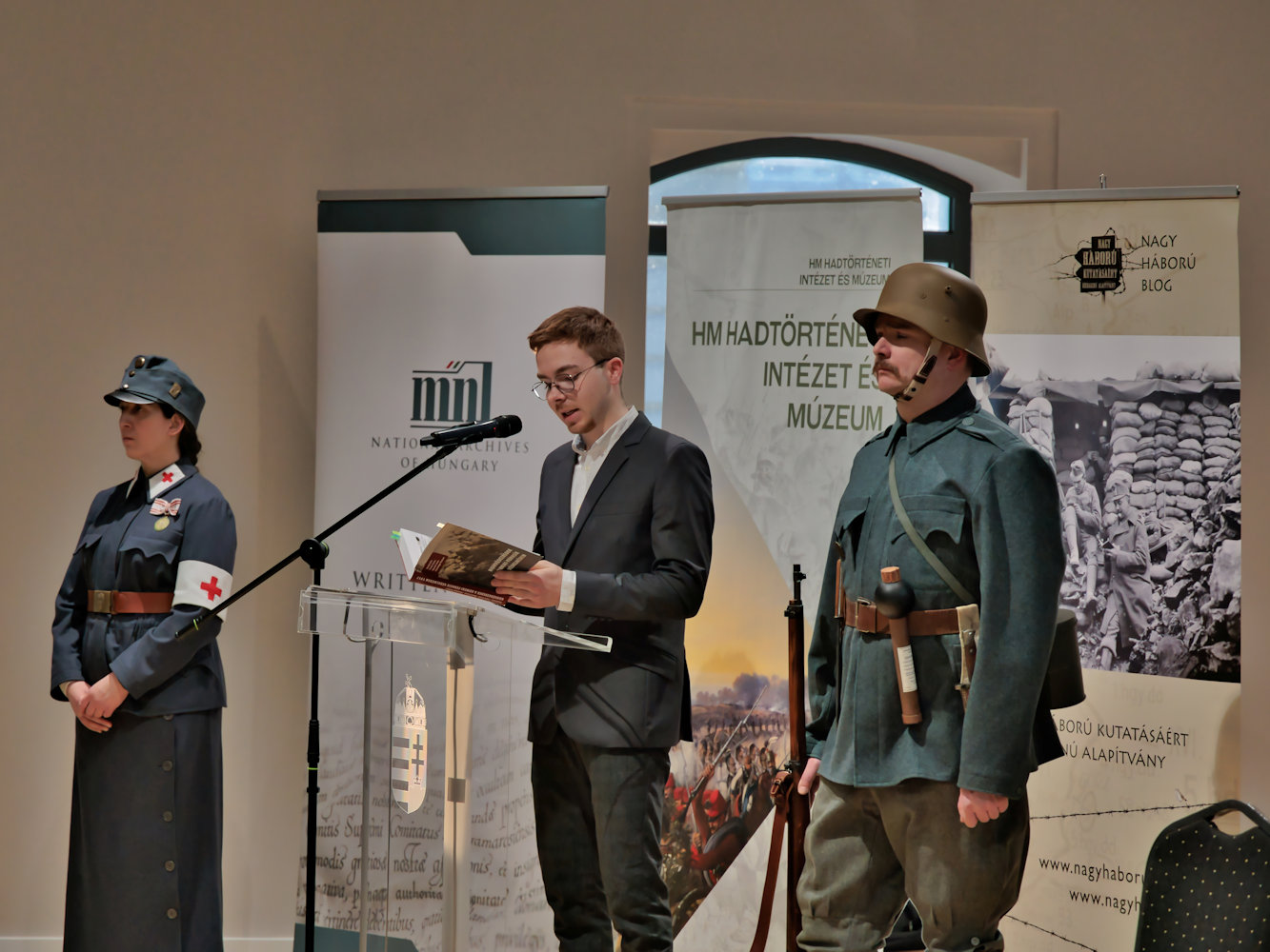 Pintér Tamás, a Nagy Háború Kutatásáért Közhasznú Alapítvány elnöke köszöntötte a rendezvény résztvevőit és mondott köszönetet a kötet létrejöttében szerepet játszó személyeknek. Két oldalt Kovács Beáta és Bálint Ferenc hagyományőrzők.
