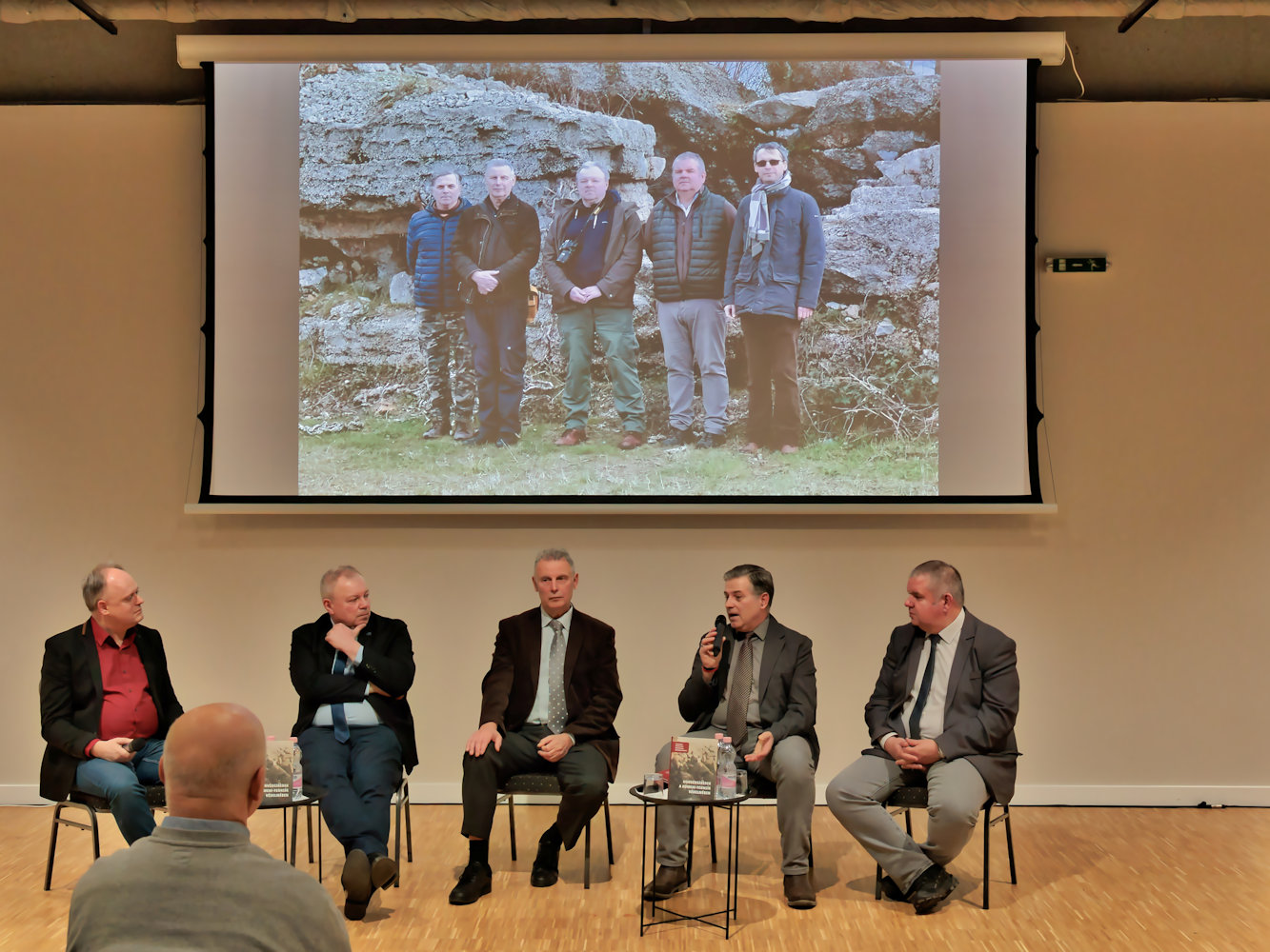 A szerzőkkel Katona Csaba, a Magyar Nemzeti Levéltár sajtóreferense beszélgetett. A könyvbemutatón a háttérben a kötet illusztrációiból Babos Krisztina által összeállított vetítés futott. A háttérben látható képen a szerzők Juhász Balázzsal állnak, aki a kötet mai fotóit is készítette.