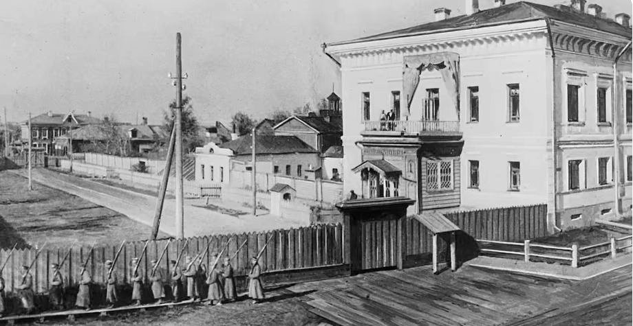 Őrségváltás a tobolszki kormányzói palotánál, amelynek első emeletén a Romanov-család lakott házi őrizetben. Az erkélyen Mária és Anasztázia nagyhercegnők állnak. A villanyoszloptól takarva látható az üvegház, amelynek tetején a cár és gyermekei szerettek napozni. A fényképet a fogság alatt a családot leggyakrabban fotózó Pierre Gilliard (1879–1962), a cári gyerekek francia nyelvtanára készítette, aki később Svájcba visszatérve könyvet is írt élményeiről; fotóarchívuma pedig ma a lausanne-i fotómúzeumban (Musée de l’Élysée) található.