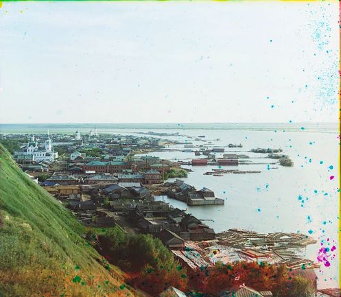 Tobolszk, a hajóállomás 1912-ben. Jól láthatóak a jellegzetes fából készült úszómólók és a part mentén sorakozó nagy, lapátkerekes gőzhajók, amelyek az Ob és az Irtisz folyókon közlekedtek. A fényképész Szergej Prokugyin-Gorszkij (1863–1944) az orosz fotográfia úttörője, aki a 20. század elején (1905–1915 között) II. Miklós cár megbízásából és támogatásával mintegy 1900 színes (!) üvegnegatívon, speciális technikával készített fényképen dokumentálta az Orosz Birodalmat, útjai során egy vasúti kocsiban elhelyezett, erre a célra szolgáló mobil sötétkamrában.