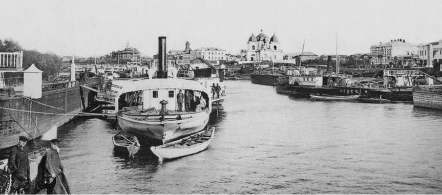 Gőzhajó-kikötő az Om-folyó torkolatánál. 20. század eleje.