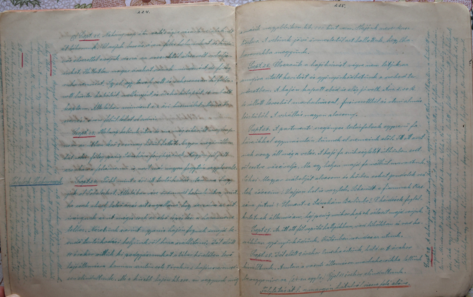 Szept. 26. A partmenti szegényes tatárfalvak egyszerű faházaikkal egymásután tűnnek el szemeink elől. Itt ott aratnak, avagy áll még a vetés. A hajó faszükségletét útközben esetről esetre vásárolja. Ma egy helyen majd fa nélkül maradtunk. Jókai Magyar nábobját olvasom és közben sokat gondolok reátok édeseim! Vajon hol is vagytok. Sikerült-e fiamnak Kassára jutni? Elment-e Iduskám Berlinbe? E kérdések foglalkoztatnak állandóan, hej, pedig mikor kapok választ majd reájuk.