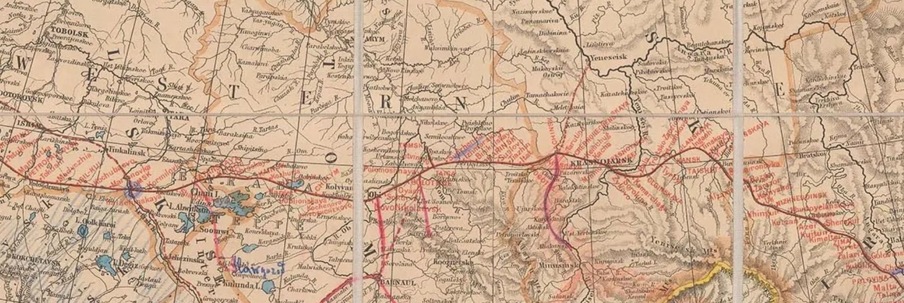 Roóbék útja a Tobolszktól Omszkig, onnan a transzszibériai vasút vonalán Nyizsnyeugyinszkig. Stanford’s Map of the Siberian Railway – Edward Stanford 1917-es kiadású, litografált térképe a vasúti hálózatot és az állomásokat jellemzően pirossal jelölte.