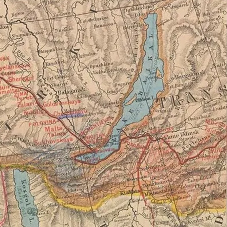Roóbék útja a transzszibériai vasút vonalán Nyizsnyeugyinszktól a Bajkál-tó körül Vernijugyinszkig. Stanford’s Map of the Siberian Railway – Edward Stanford 1917-es kiadású, litografált térképe a vasúti hálózatot és az állomásokat jellemzően pirossal jelölte.