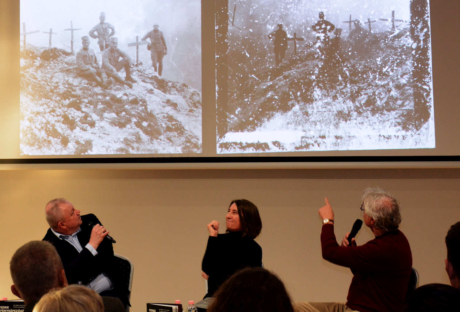 A könyvbemutató főszereplői. A háttérben a kötet fotóiból összeállított diavetítés futott.