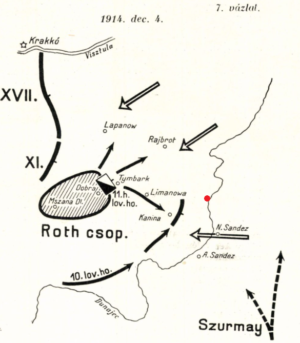 A Limanovai ütközet idejében zajló hadműveletek az ezredtörténet egyik ábráján. Piros ponttal megjelölve Zawadka település hozzávetőleges pozíciója. A járőregység a szabadulását követően átkelt a Dunajecen és Új-Szandecbe mentek. Innen másnap elindultak Tymbarkra, mivel az ezredtörzs illetve az 1. és a 4. század itt állomásozott tartalékban. (Forrás: A m. kir. debreceni 2. honvéd huszárezred története 1869-1918. Szerk. Radák Lajos. Bp. 1939.)